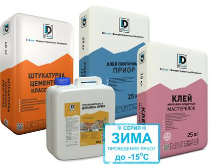 - противоморозная добавка DeLuxe ФРИЗ для добавления в стандартные цементные смеси при работах в условиях пониженных температур до -15 Сº.