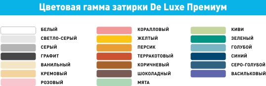 Компания «Фаворит» предcтавляет затирку De Luxe ПРЕМИУМ. Палитра затирок De Luxe ПРЕМИУМ включает 20 цветов. В неё вошли самые востребованные оттенки, которые отлично комбинируются с любым видом плитки. При производстве затирки De Luxe ПРЕМИУМ используются высококачественные пигменты из Германии.